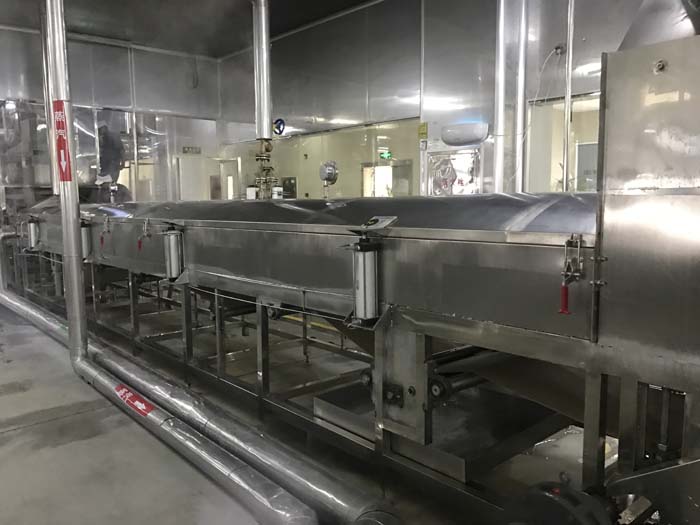 After steaming for a few minutes, rice sheet will be feeding into the extruder, and then extruded into rice paste sheet which increase its density;